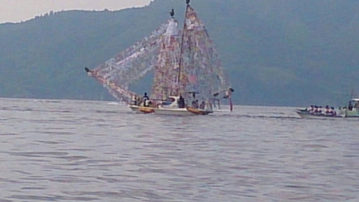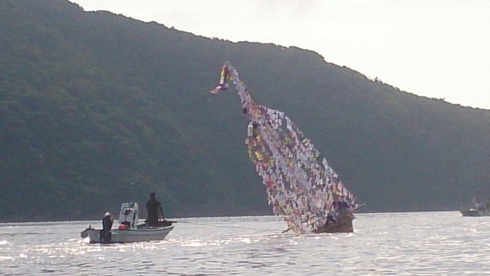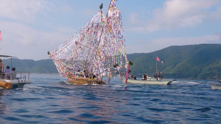 シャーラ船は盆に迎えた先祖の霊を精霊船に乗せて海に送る送り盆の行事です。このような行事は各地に見られますが、隠岐郡西ノ島町美田地区5集落(船越・小向・大津・市部・波止)、浦郷地区3集落(浦郷・赤ノ江・珍崎)では、子供たちも参加しながら集落ごとに大きなシャーラ船を作り、子供たちが各家・墓から集めた旗(盆旗)や供物を船に乗せ、自らも船に乗り込んで精霊を送ります。盆の期間には、島外に出た多くの人が子供を連れて帰省しシャーラ船に参加します。集落あげての行事であるとともに、浦郷・船越の船のように全長10mを超える大きなシャーラ船が美田湾をえい航される姿は隠岐の夏の風物詩ともなっています。
