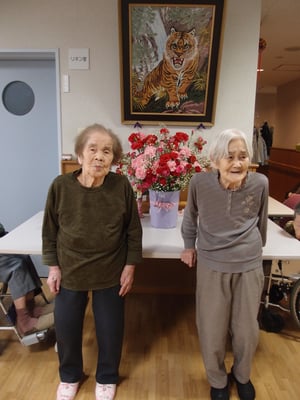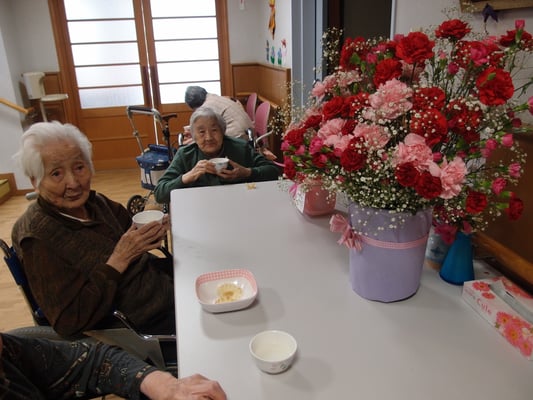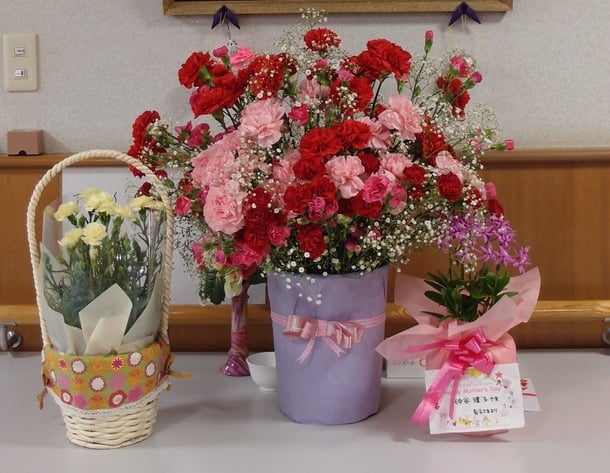 カーネーションや利用者さんのご家族から届いた花を飾って皆さんで写真を撮りました。